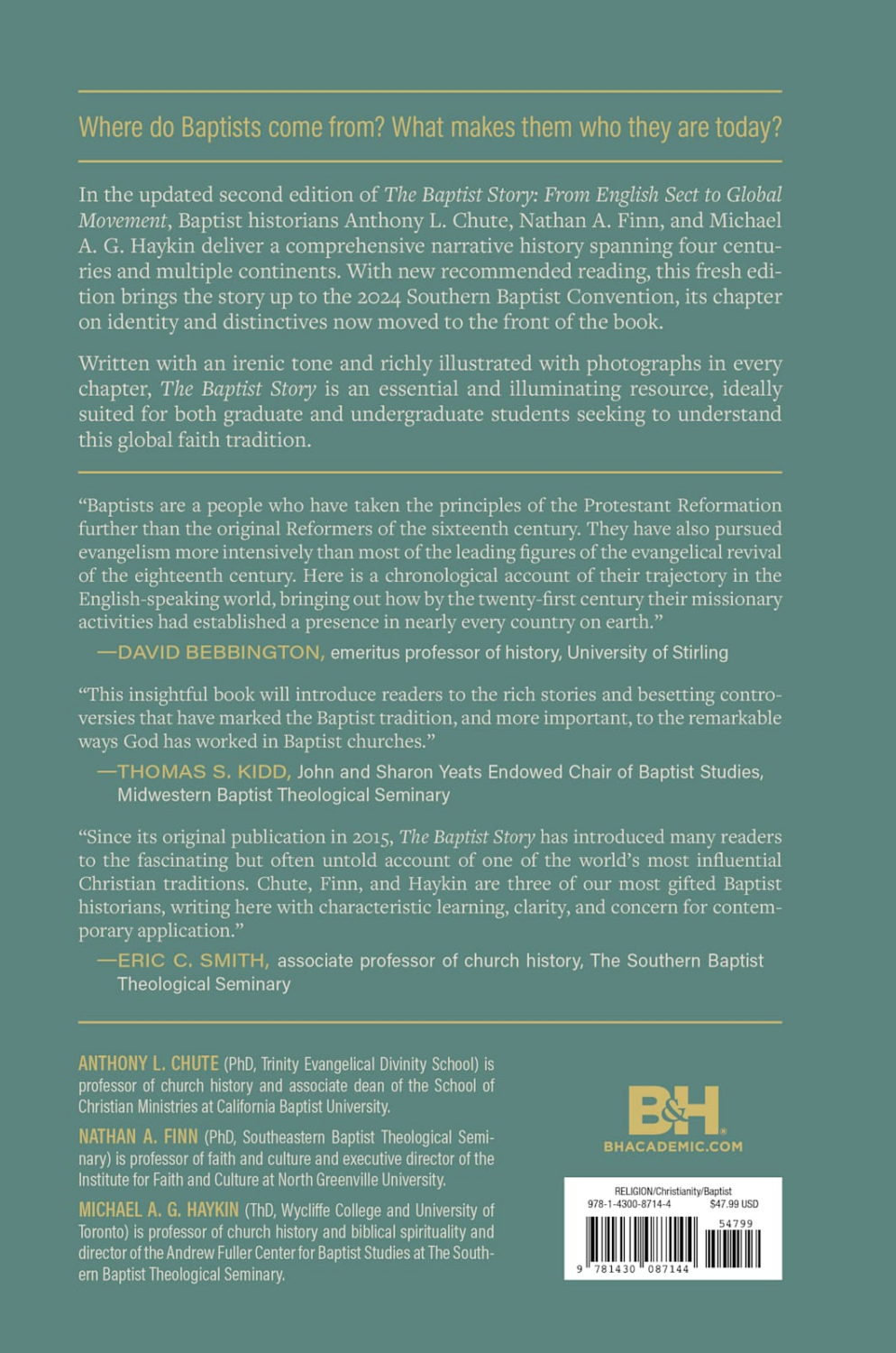 In this new edition, Baptist historians Anthony Chute, Nathan Finn, and Michael Haykin provide a fresh update, detailing events up to the 2024 Southern Baptist Convention, relocating their chapter on identity and distinctives to the front of the book, and adding new recommended reading resources.